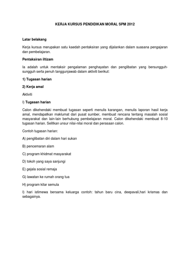 Selain itu kerja kursus ini juga penting iaitu merupakan syarat kepada semua pelajar tingkatan 6 untuk lulus dengan cemerlang dalam stpm. Panduan Kerja Kursus Pendidikan Moral 2012 Wwwmystudyguide Dec 27 2020 KERJA KURSUS PEKA PENDIDIKAN MORAL 12252 IKUT KP. ARAHAN KEPADA CALON Calon SPM yang mengambil mata pelajaran Pendidikan Moral wajib melaksanakan kerja kursus.
